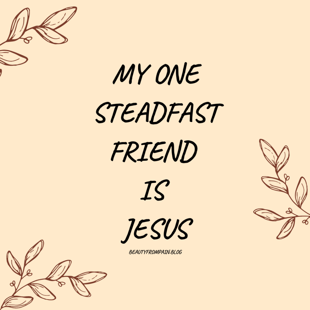 God has put all of these, and many others not mentioned in my life at specific times. But the one steadfast friend is Jesus. He has always been there for me, even when I was not looking for him. I can look back at times in my life now and know he has been there all along. He’s my provider, my protector, my comforter, my counselor. He has been a best friend to all. I am reminded of the old hymn, “What a Friend We Have in Jesus.” These are the words to the last stanza: